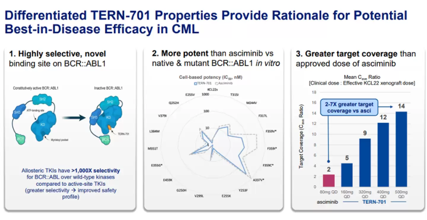 早期体外实验显示,TERN-701的效力强于Asciminib,对野生型及多种突变型BCR::ABL1均有效,尤其在携带T315I突变及复合突变的患者群体中,展示出差异化的治疗活性。