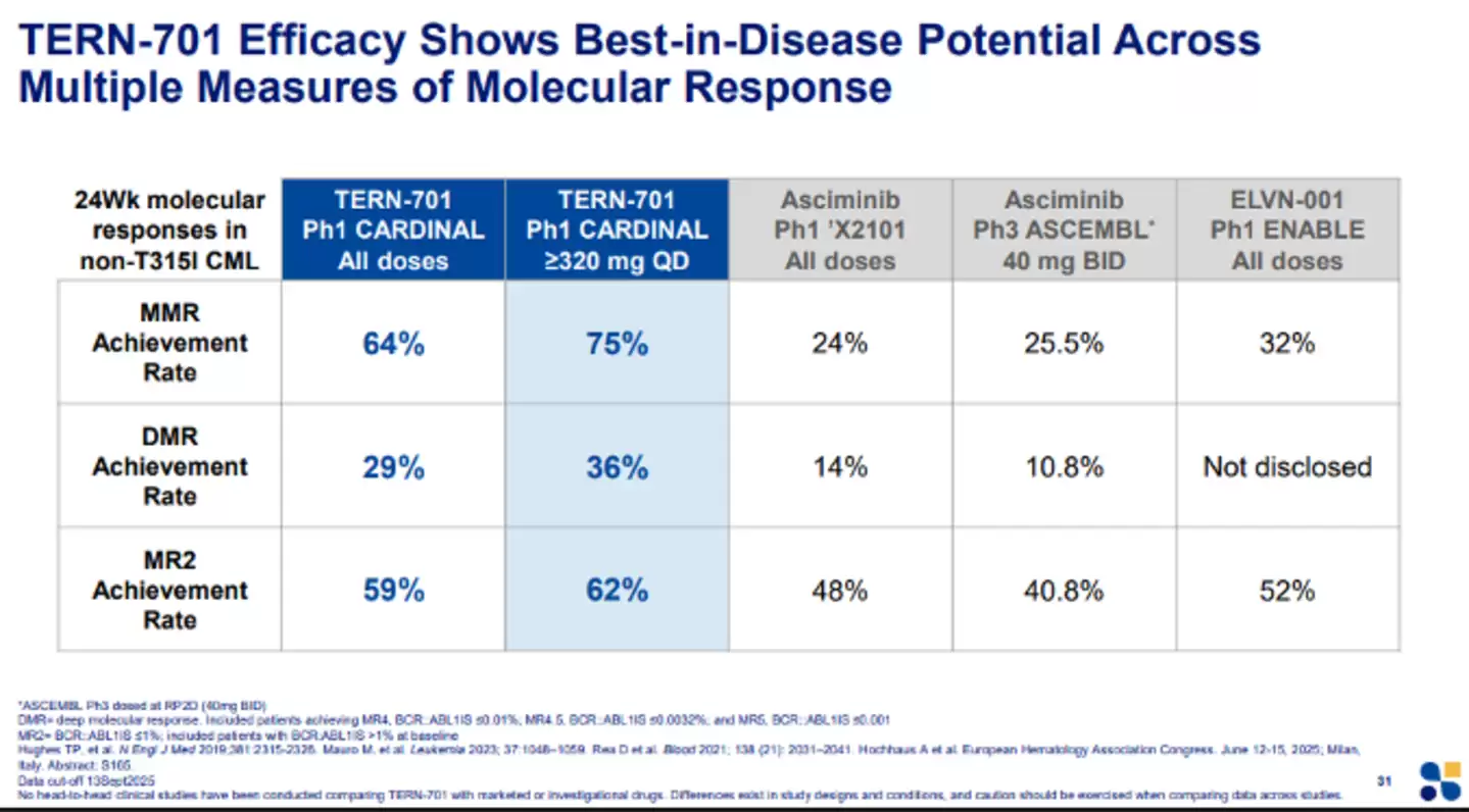 从作用机制上看,TERN-701同样属于变构抑制剂,但在衡量治疗深度的关键指标——主要分子学缓解(MMR)和深度分子学缓解(DMR)上,它的表现更为出色。