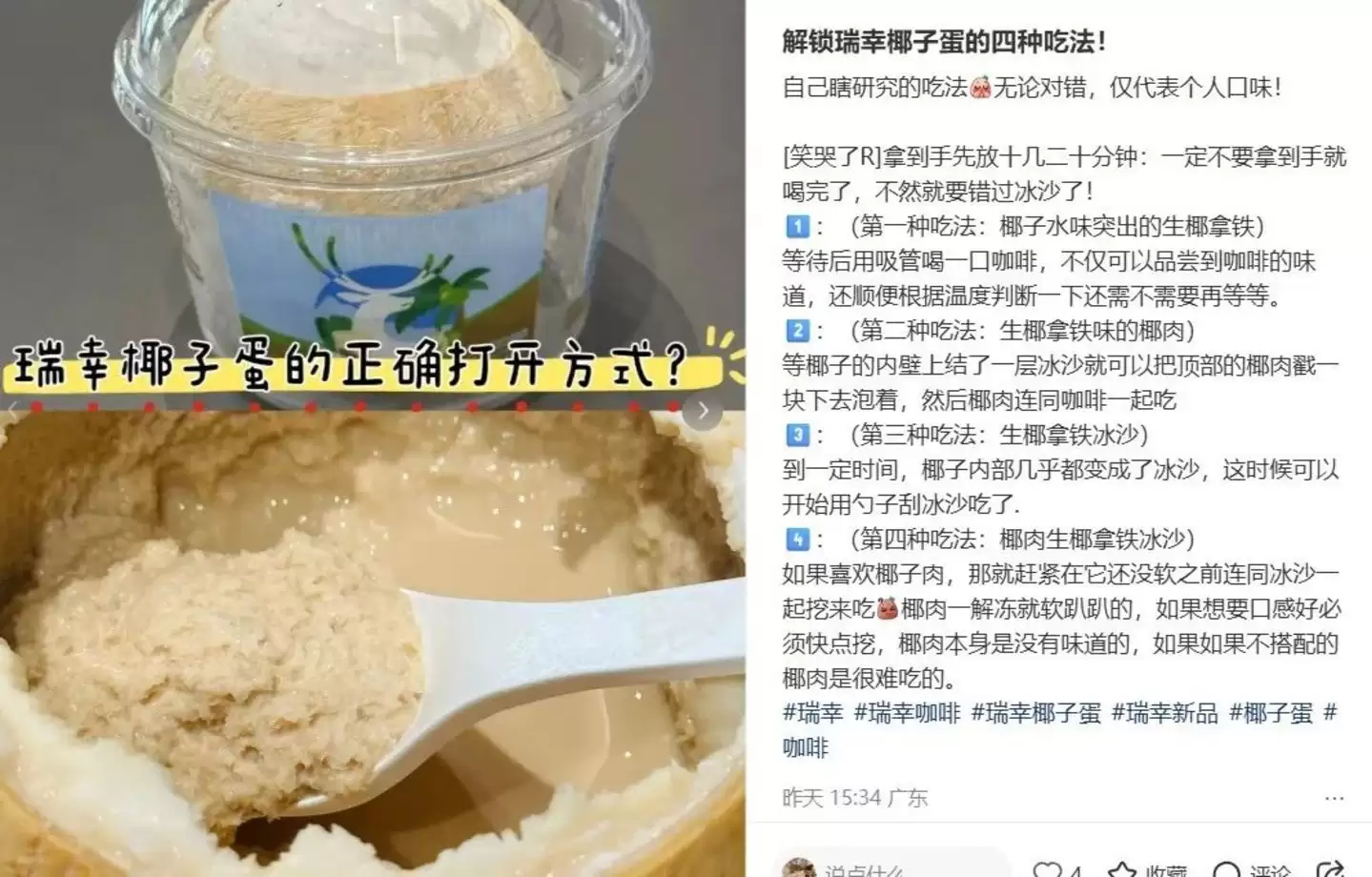这也成了这款新品最大的宣传点。官方推荐的食用顺序是:一喝咖啡,二吃沙冰,三刮椰肉。围绕这个流程,小红书上甚至衍生出了一套完整的“食用攻略”。