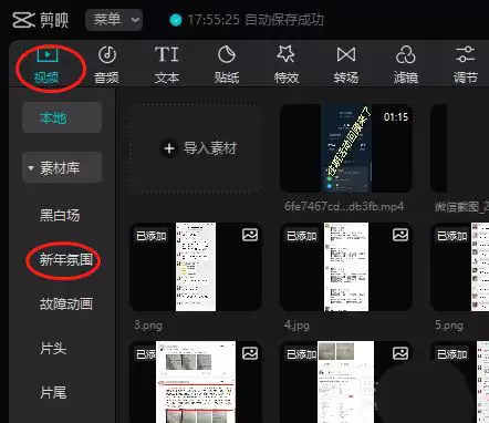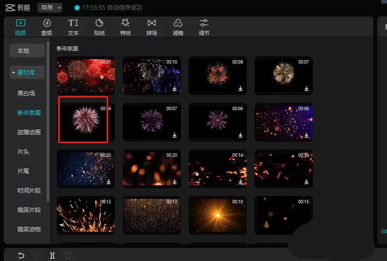 关键步骤来了。选中时间轴上的这段视频,留意一下界面下方,你会找到“新年氛围”或者类似的分类标签。点击它,里面藏着不少好玩的特效。