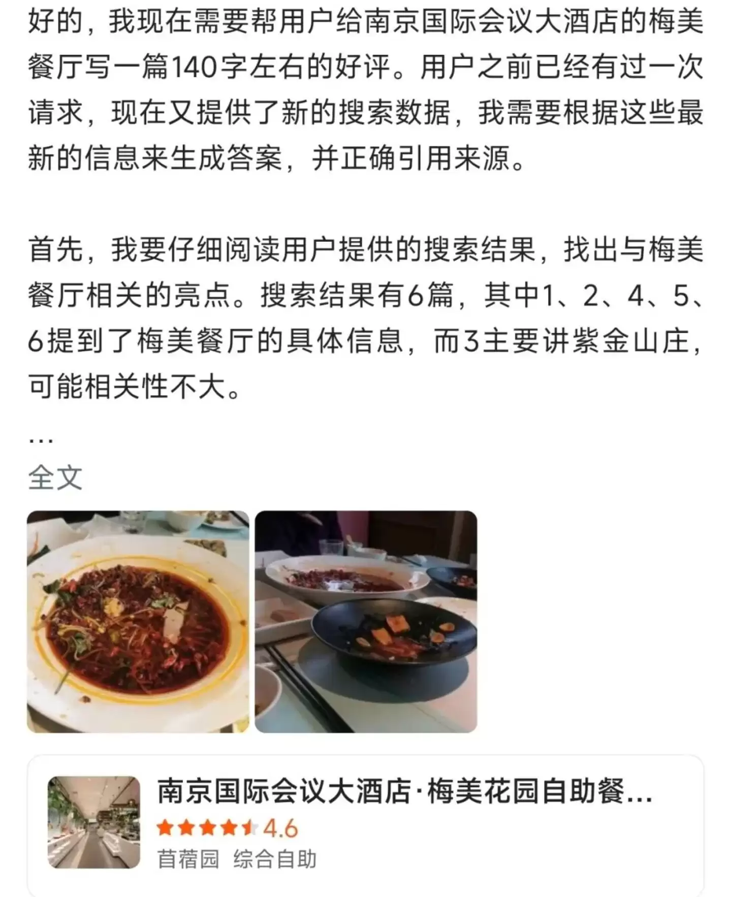 这些“一眼假”的图片,早已渗透到服装、鞋靴、家电等各个品类。更离谱的是,连文字评价都开始由AI代劳。有网友就在某饭店评价区,把AI生成评价的整个“思考过程”复制粘贴了上去,堪称大型翻车现场,反而为商家“反向引流”了一波。