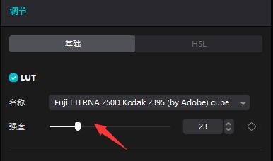 这里还有个关键细节:LUT的强度是可以调节的。这个滑块控制着调色效果的浓淡程度。有时候,一个效果全开可能太重,拉到50%或70%,反而能获得更自然、更高级的质感。