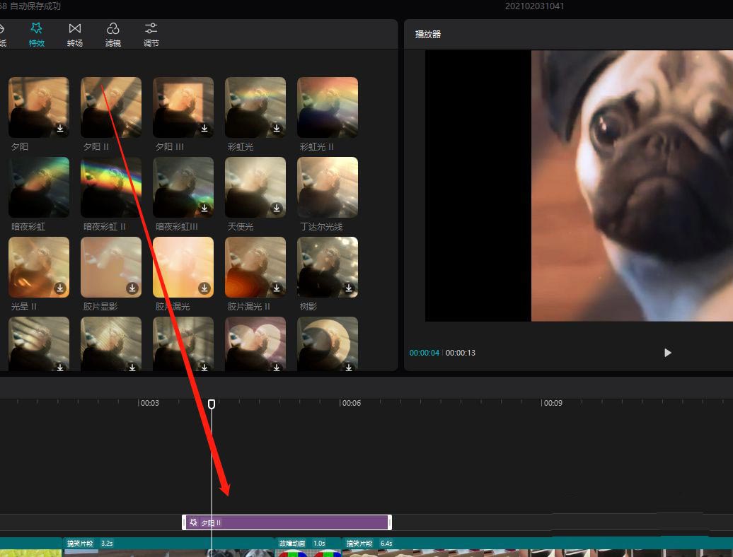 应用特效的操作很简单:直接将“夕阳”特效拖拽到时间轴上,覆盖在你的视频素材上方。看,画面瞬间就被温暖的夕阳余晖笼罩了,那种朦胧又唯美的氛围感一下子就出来了。