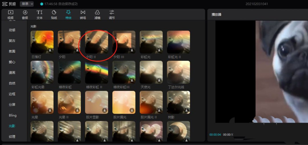 进入特效库后,你会发现分类很多。这里的关键是,在左侧分类栏中找到“光影”类别。往下滑动,一个名为“夕阳”的特效就在那里等着你了,直接点击下载或使用即可。