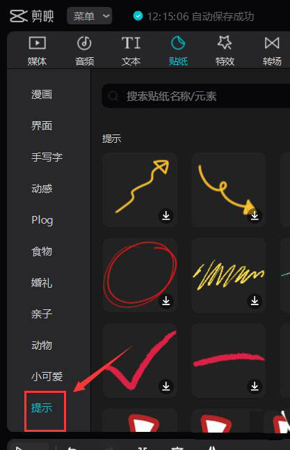 有了舞台,接下来就需要“演员”了。再次点击贴纸分类,这次切换到【提示】页面。