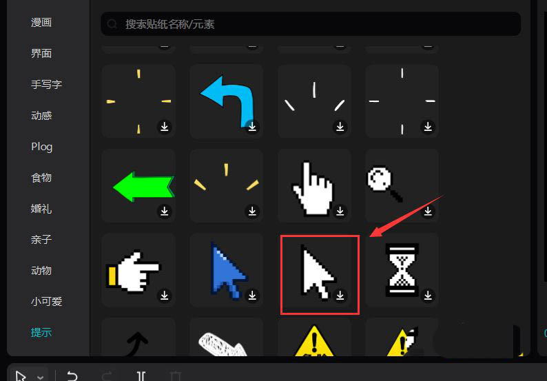 在提示类贴纸中,不难找到一个标准箭头的【鼠标】图标贴纸,选中它并添加到时间轨道上。
