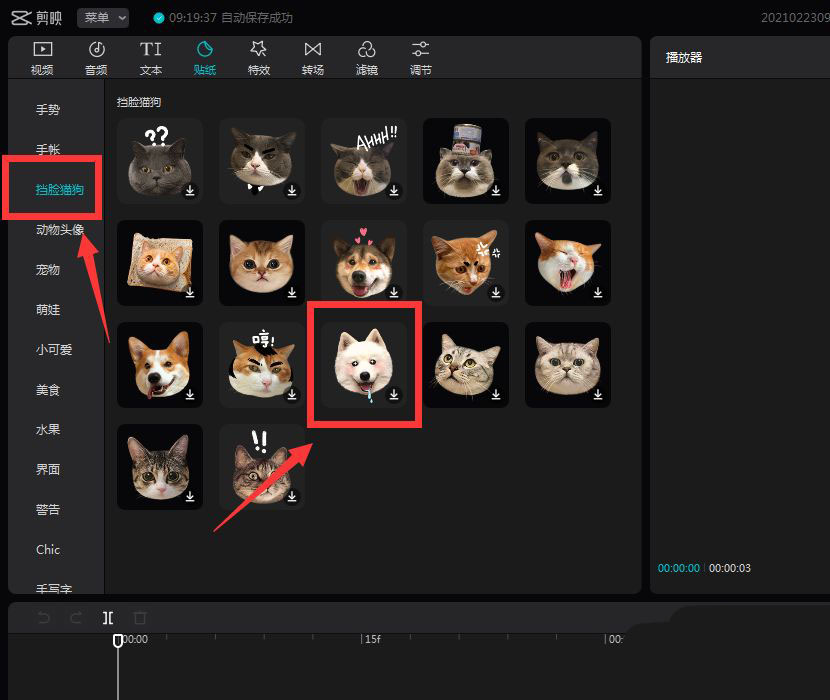 比如,你想给视频里的人物加一个搞怪又可爱的脸部遮挡效果?那就可以在贴纸分类里,直接搜索或者翻找“挡脸猫狗”这类贴纸。看到心仪的款式后,只需要点击旁边的“+”号,它就会自动添加到你的视频轨道上。
