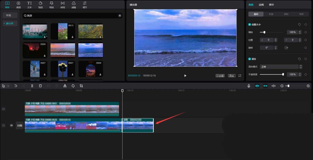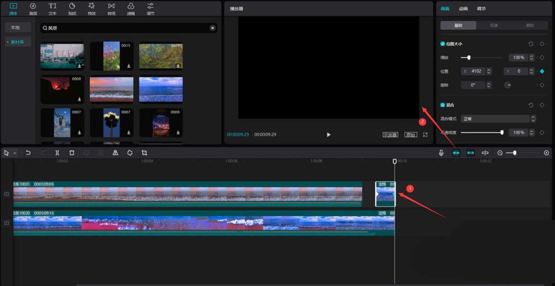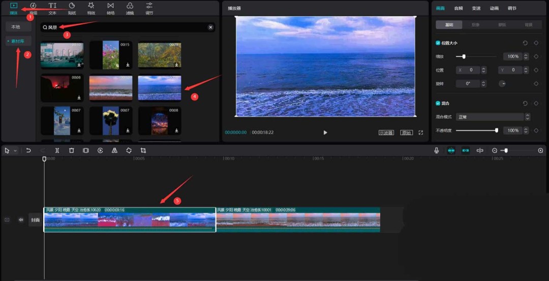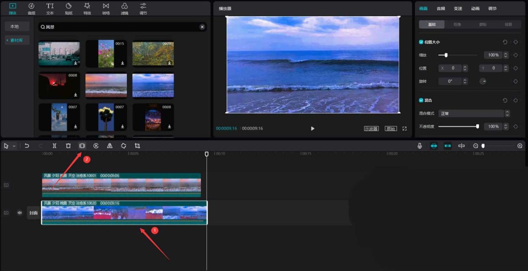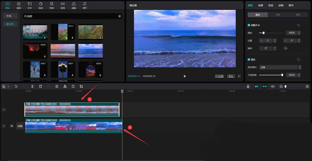 首先,打开你的剪映专业版软件。在媒体面板中,点击素材库,直接用“风景”作为关键词搜索,挑出两段心仪的视频素材,把它们拖到主视频轨道上备用。