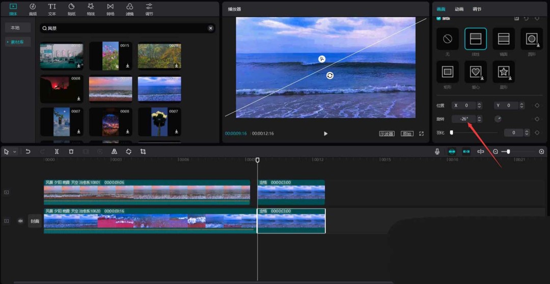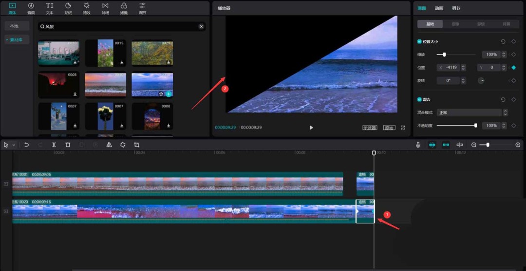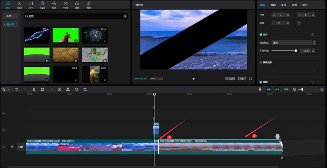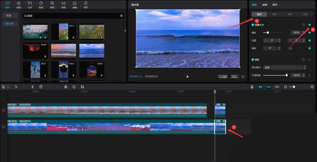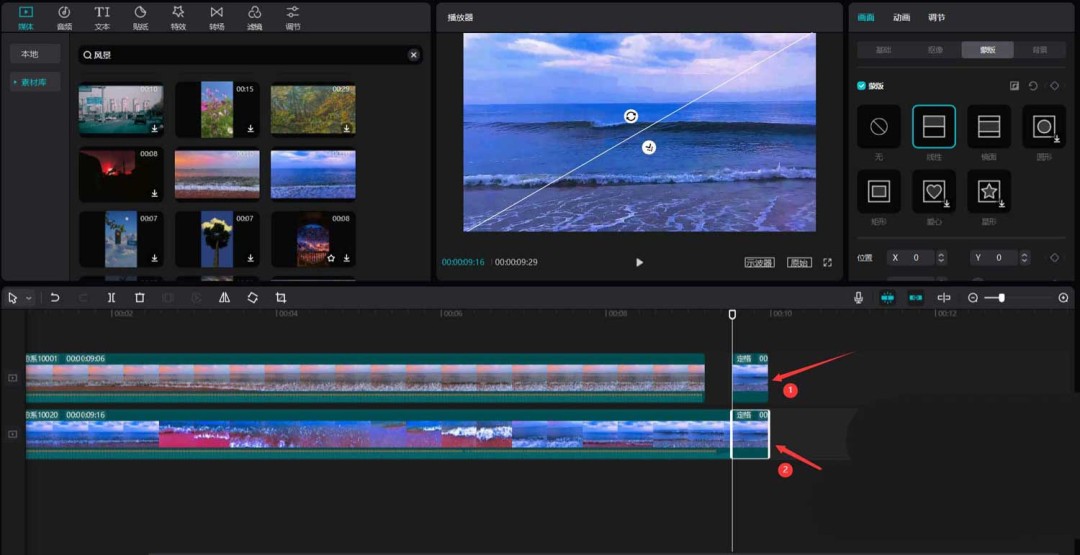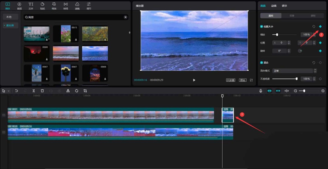 首先,打开你的剪映专业版软件。在媒体面板中,点击素材库,直接用“风景”作为关键词搜索,挑出两段心仪的视频素材,把它们拖到主视频轨道上备用。
