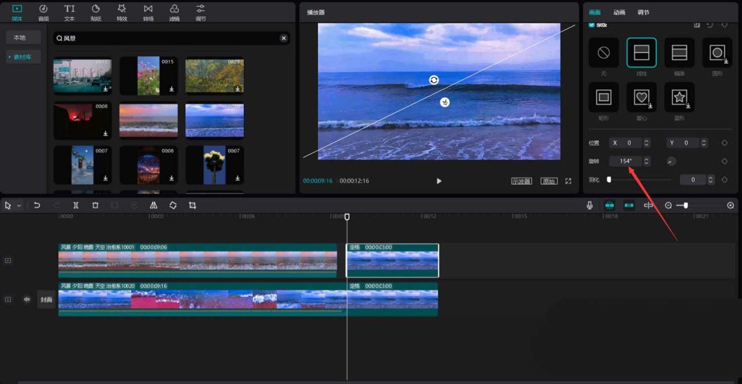 接着,选中复制出来的那份定格素材,同样为其添加一个“线性蒙版”。关键在于,这次要把旋转角度设置为“154度”。