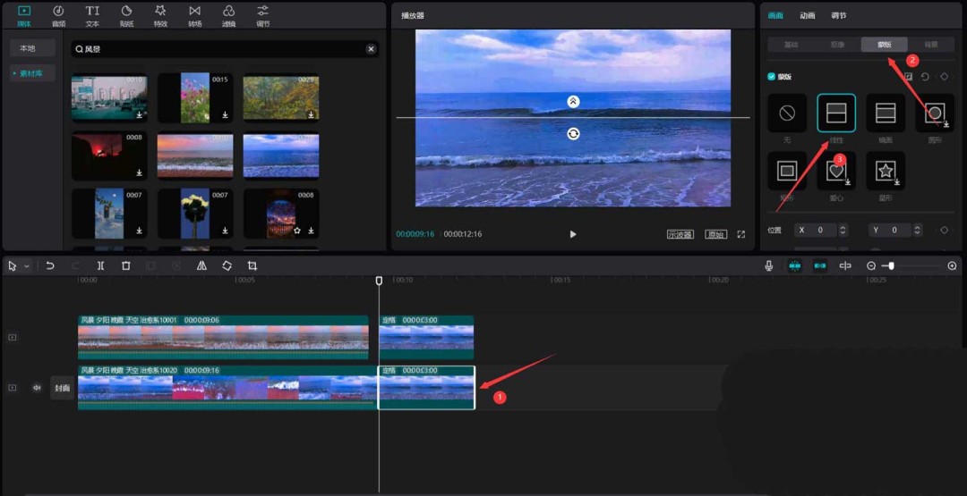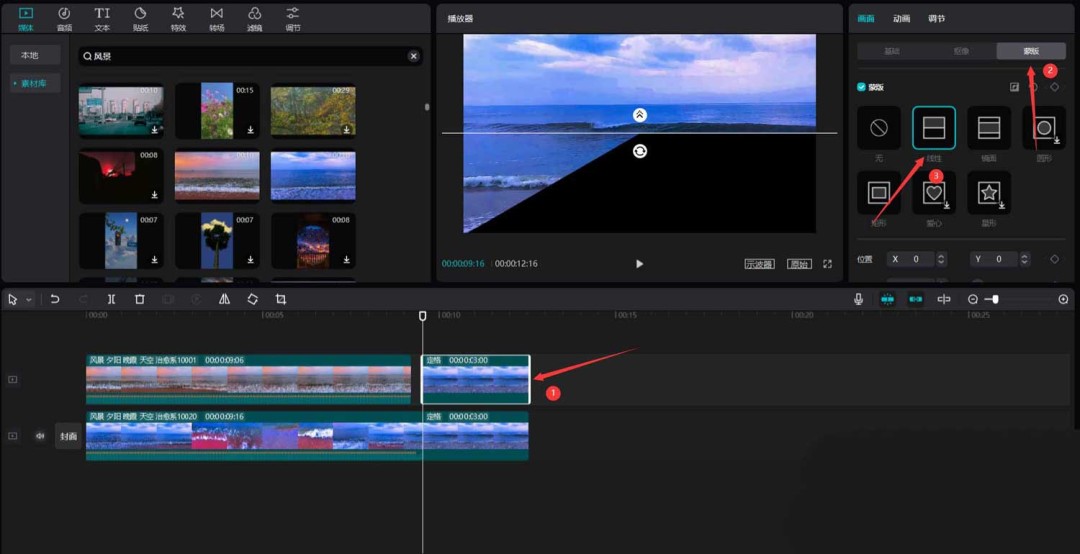 选中原始的那份定格素材,在右侧参数面板中找到“蒙版”功能,并选择“线性蒙版”。这时,画面中央会出现一条分隔线。