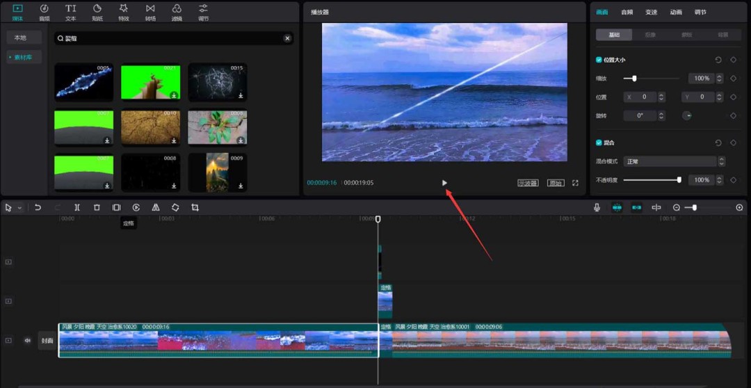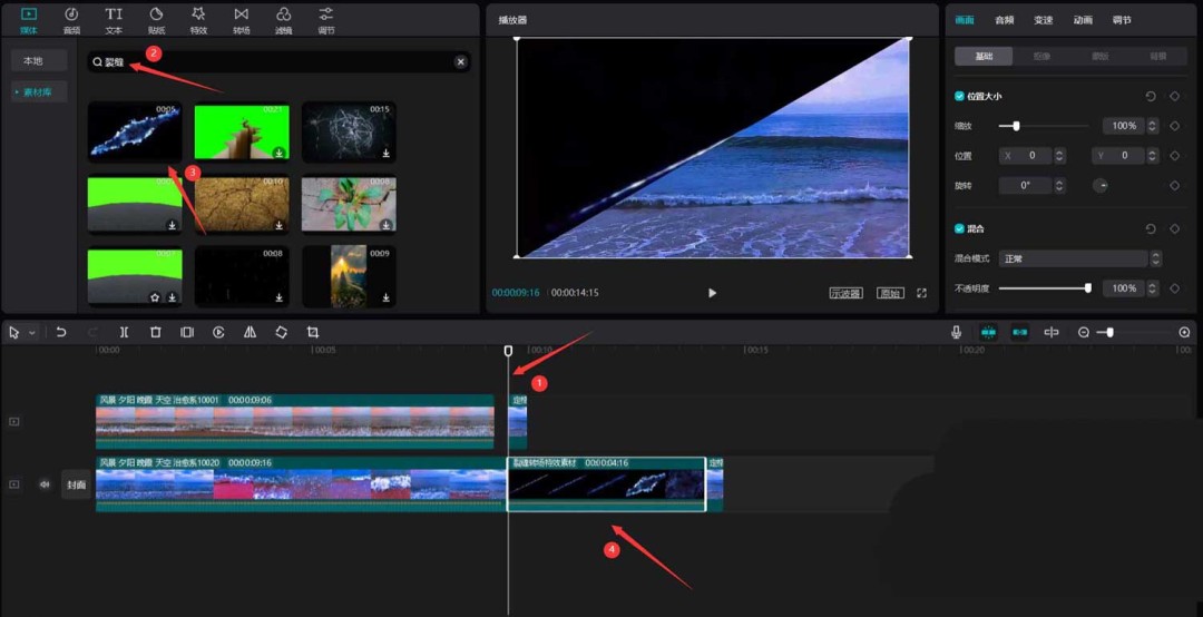 效果已经有了,但还想更酷?可以给“切割”的瞬间加点特效。把时间轴移回两段定格动画开始的地方,在素材库中搜索“裂缝”,挑选一个合适的特效视频(例如下图中的素材3),将其添加到视频轨道中。