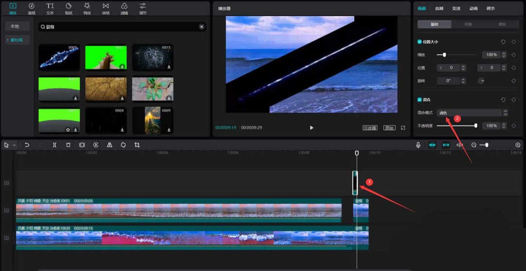将这个裂缝特效素材拖到上层轨道,覆盖在刚才的定格动画上方。将其时长缩短到大约定格动画的三分之一(即0.3秒左右),让它只在切割的瞬间闪现。最后,在右侧面板中将它的“混合模式”改为“滤色”,这样黑色的背景就会消失,只留下白色的裂痕效果。