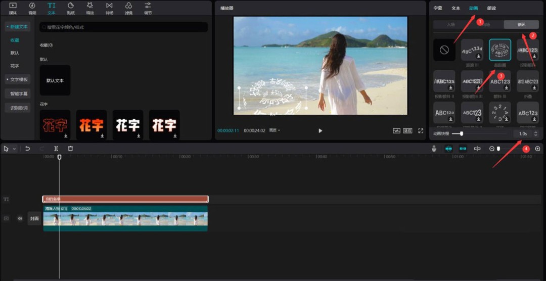 重头戏来了——添加3D动画。选中文本轨道,点击右侧检查器面板的「动画」按钮。在动画列表中,找到「循环」这一类别,里面有个效果叫“甜甜圈”。没错,就是它,这个动画能赋予文字一种环绕立体的运动感。点击应用后,别忘了把动画的「快慢」时长调节到1秒左右,这样动态效果会更利落。设置界面见下图。