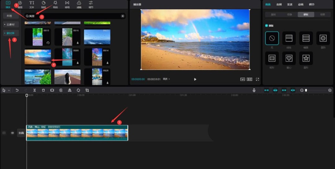 到了应用环节。回到你的主视频项目,导入一段背景素材(比如在素材库搜索“风景”选中的视频),并放到主视频轨道。