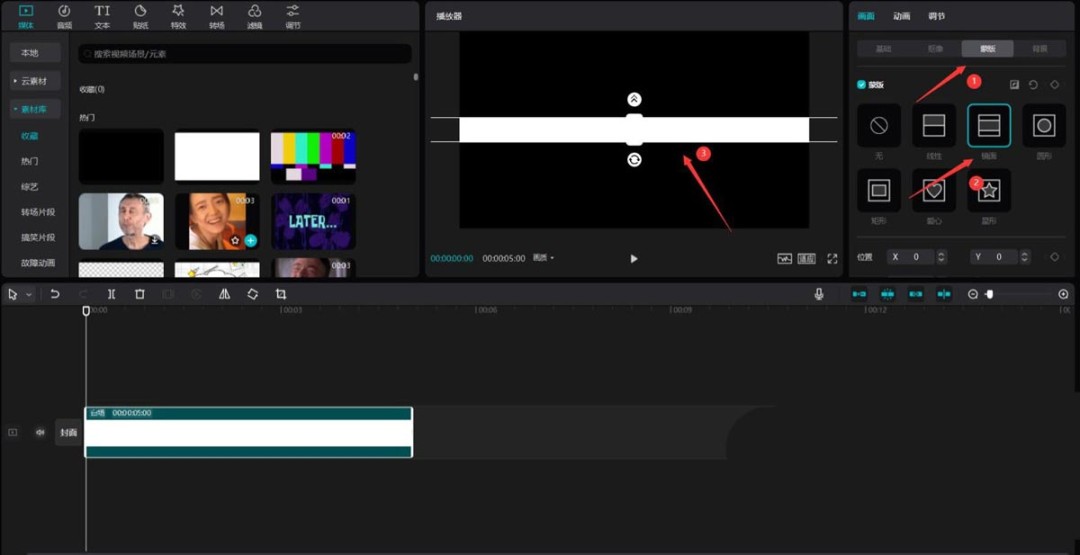 选中这条白场素材,在右上角的参数面板中,找到并点击“蒙版”功能。在众多蒙版类型里,这次选择“镜面蒙版”。然后,就需要手动调整蒙版的宽度,把它缩窄到一条线的状态。