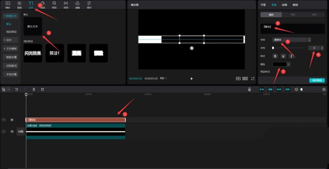 接下来添加文字。点击左侧“文本”,选择一个默认文本样式,添加到文本轨道。把文字内容改为你想用的标题,比如“『趣谈』”。然后,在右边的参数面板里,挑选一个好看的字体(例如示例中的“漫语体”),并将颜色设置为黑色。