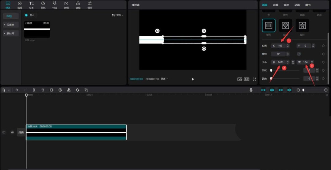 是时候定义我们字幕条的精确尺寸了。在蒙版参数里,手动调整具体数值,比如这里可以将 X 轴位置设为 195,长度设置为 1475,宽度设为 124。这样,一个长度适中、轮廓清晰的字幕条外框就成型了。