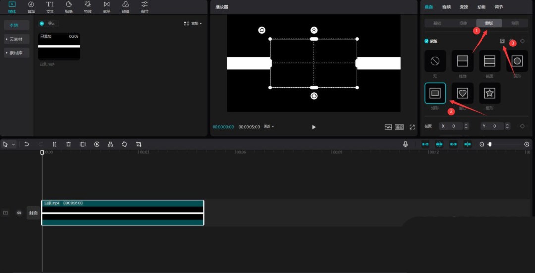 选中这个视频,再次打开“蒙版”功能。这次我们切换成“矩形蒙版”。然后,一个关键动作是:点击旁边的“反转”按钮,让蒙版区域反过来。现在,你的白色横线应该变成了一个被镂空的、四周有白边的黑色矩形条。