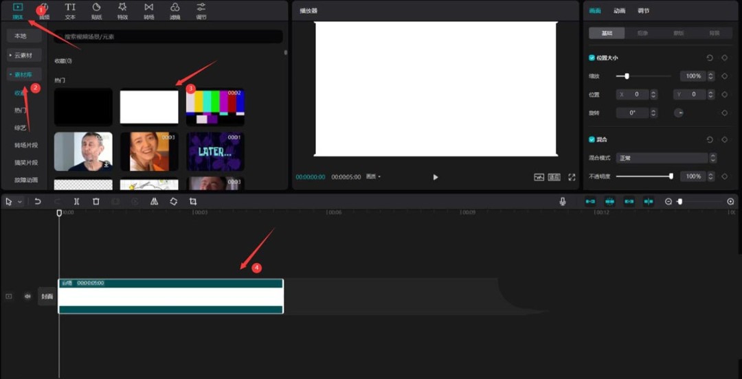 第一步,启动剪映专业版。进入编辑界面后,先找到左侧的“媒体”按钮,接着点击“素材库”标签。关键来了:这里需要选择一个“白场”素材,然后把它拖到下方的时间线视频轨道上备用。