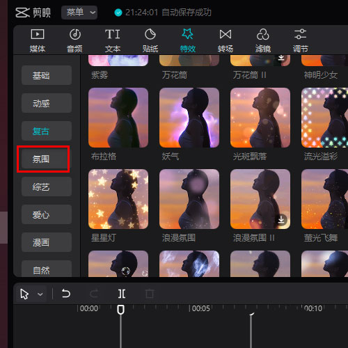 点击之后,下方会展开丰富的特效分类。咱们这次要找的是“氛围”类特效,对,就是那个能瞬间改变视频情绪的分类,点击它。