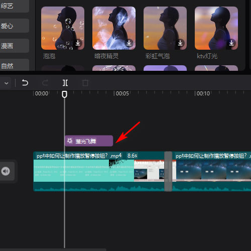 看,就这么简单。点击之后,“萤光飞舞”特效就已经成功添加到你的视频轨道上了。整个过程是不是非常流畅?