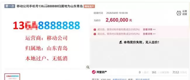 最近阿里拍卖上的一则消息,让不少围观者直呼“看不懂”。4月4日,一个归属地为山东青岛、尾号为“8888888”的手机号悄然上架,标出了260万元的起拍门槛。然而,足足24小时的拍卖周期过后,这个吸引了七千多人次围观的“顶级靓号”,却因无人举牌而黯然流拍。