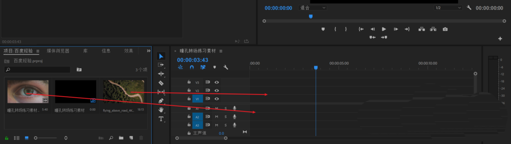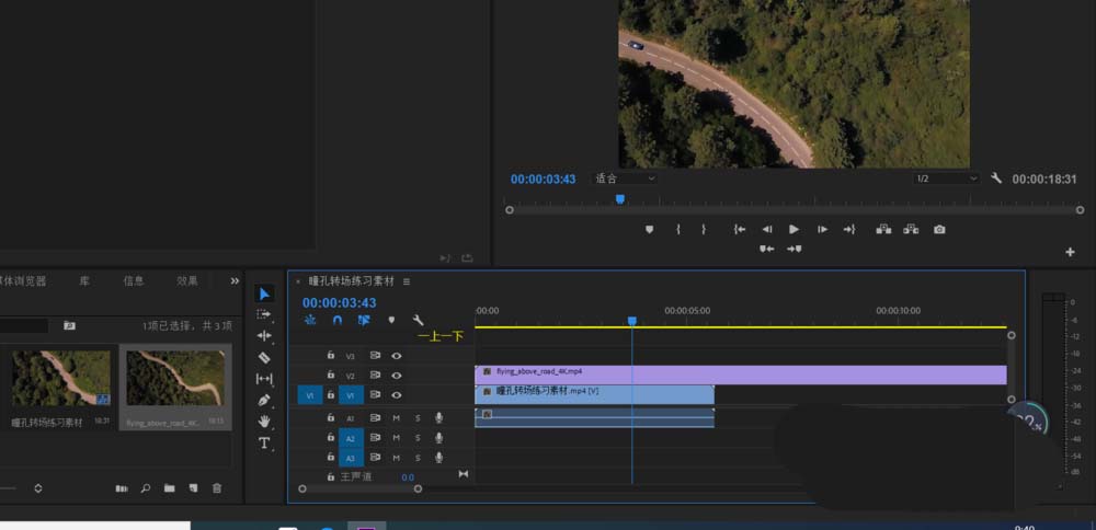2、这里有个细节需要注意:两个视频轨道是一上一下排列的,而不是叠加在一起。可以这么理解,就像两张纸叠在一起,上层的视频会完全覆盖住下层的素材。