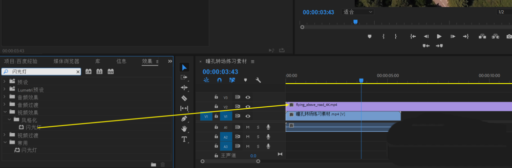 3、接下来,在“效果”面板里搜索并找到“闪光灯”效果,将它拖拽应用到上层的视频素材上。