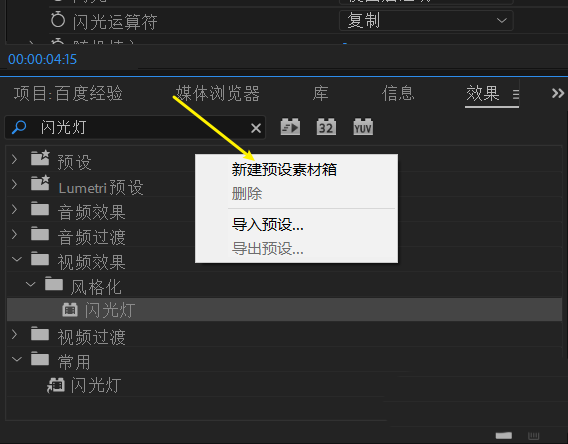 4、顺便分享一个提升效率的小技巧:不必每次都打字搜索常用效果。你可以右键点击“闪光灯”效果,选择“创建预设”,然后给它起个名字。之后,把这类常用特效都拖进同一个预设箱里,用起来就方便多了。