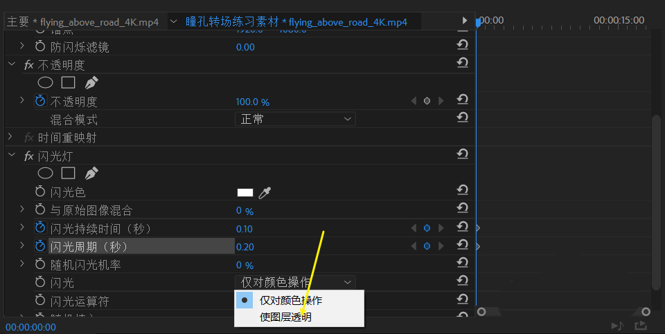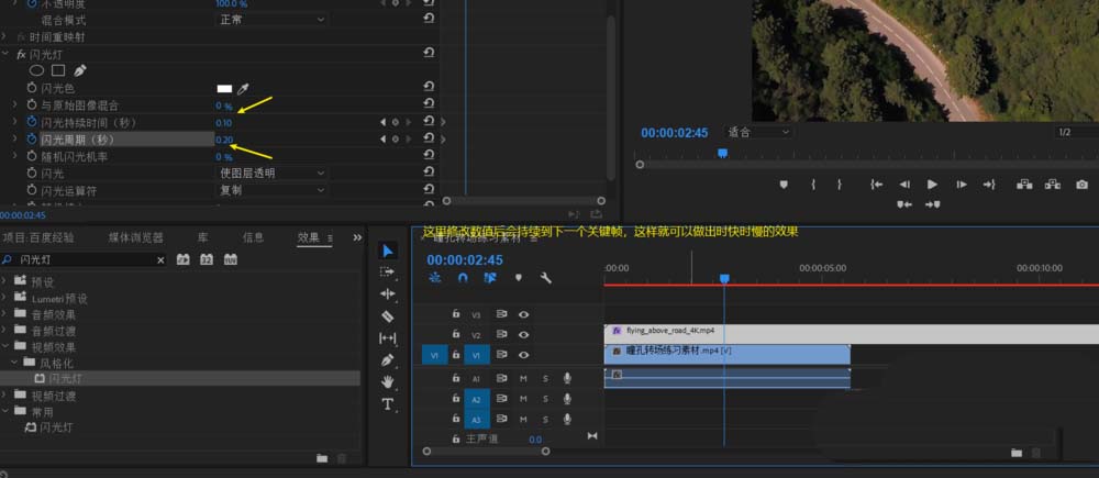 5、回到正题。选中上层视频,在“效果控件”面板中找到“闪光灯”效果,向下滚动找到参数。将“闪光持续时间”和“闪光周期”分别设置为0.1秒和0.2秒。记住一个原则:周期一定要比持续时间长,这样才能产生闪烁的间隙。