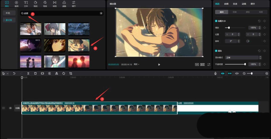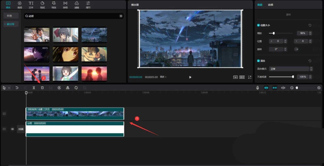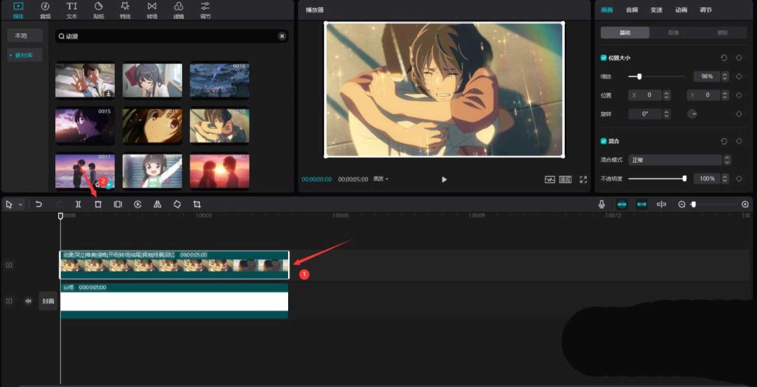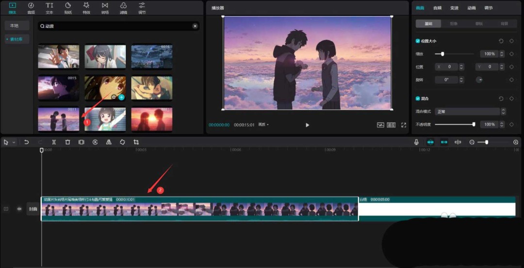 接下来,我们要制作第一张“照片”。在素材库的搜索栏里输入关键词,比如“动漫”,挑选一段你喜欢的视频素材,同样将它添加到视频轨道中。