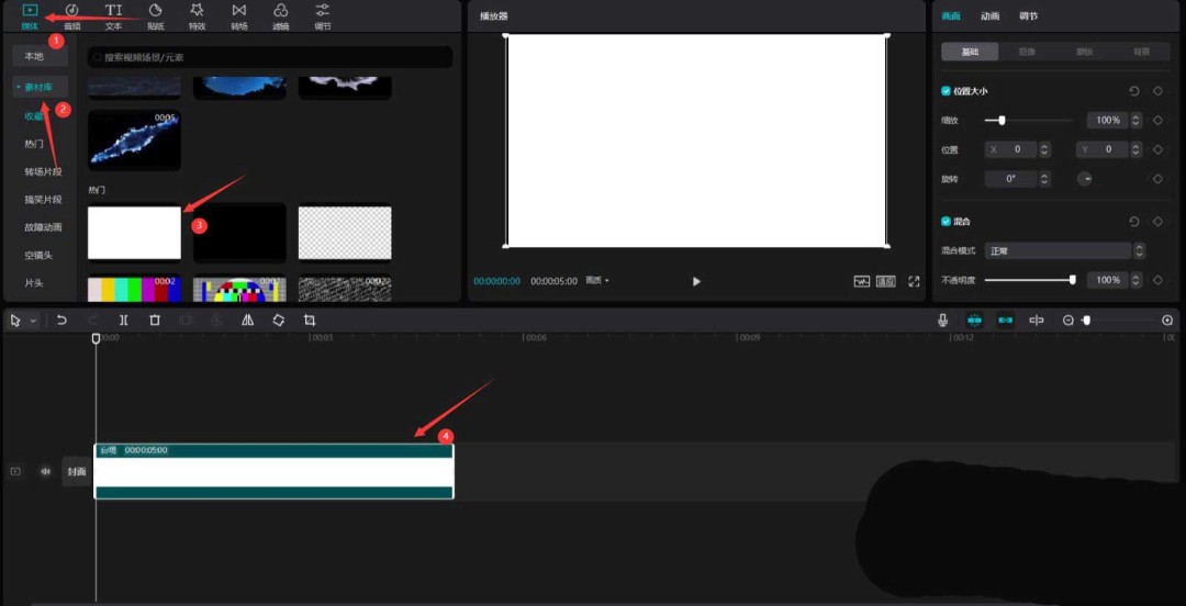 我们先从搭建一个纯净的背景开始。点击左侧的“媒体”按钮,进入“素材库”,找到一段“白场”素材,把它拖到最下方的视频轨道上。这个白色画布就是我们后续所有操作的底板。