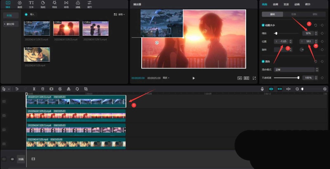 真正的魔法开始了——布局。选中轨道上的第一段视频,在“画面”->“位置”设置里进行调整。先将缩放比例改为50%,然后调整X轴和Y轴的数值(例如X: -1325, Y: 593),将它移动到屏幕的特定位置。这相当于决定了第一张“照片”在墙上的摆放地点和大小。