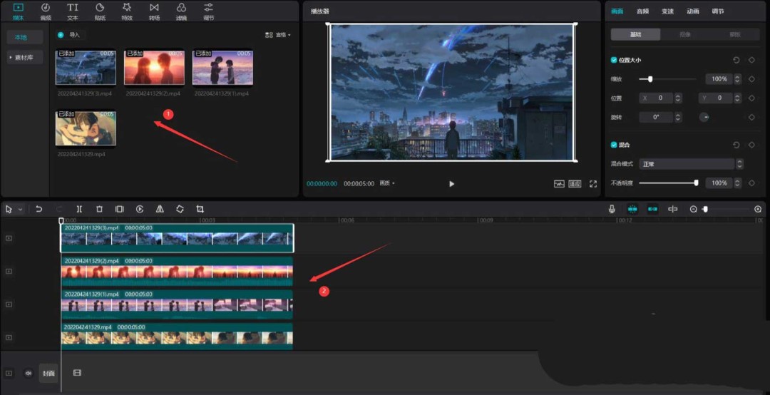重复上面的过程。从素材库再选一段新视频,添加到轨道上方的同一位置。