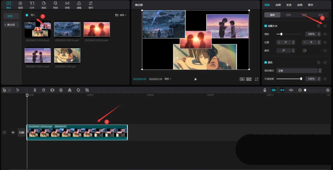 点击“本地”选项卡,再点击“导入”,找到并勾选刚才导出的那四个视频文件,将它们全部导入到剪映的媒体库中。