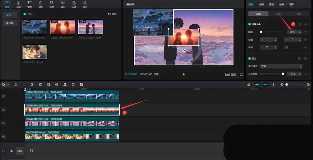 接着选中第二段视频。这次我们把缩放比例调成30%,让它以更小的尺寸呈现。位置可以先保持默认,或者稍作调整,目的是营造大小错落的感觉。