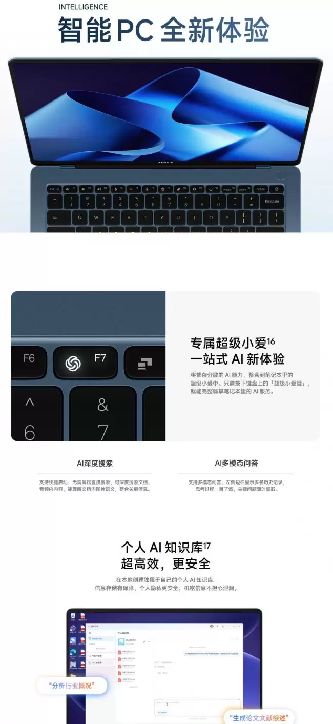 话说回来,这次更新之所以备受期待,关键在于那枚实体键盘上的「超级小爱键」。轻轻一按,就相当于为这台笔记本解锁了一个专属的AI助理中心。具体能干什么呢?核心功能可以概括为三大块:AI深度搜索、AI多模态问答,以及创建个人AI知识库。