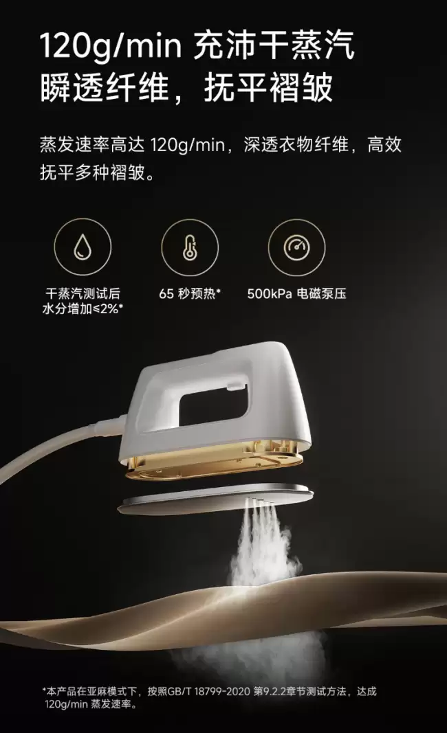 说到核心性能,这款机器主打的是高效的蒸汽熨烫体验。它把预热等待时间压缩到了惊人的65秒,几乎是随开随用。蒸汽发生速度达到了每分钟120克,这保证了蒸汽能快速、充沛地穿透织物。背后提供强劲动力的,是一颗500kPa压力的电磁泵,这意味着蒸汽不仅量大,而且冲击力足,能更有效地抚平顽固褶皱。值得一提的是,它还内置了一块直观的彩色屏幕,一键即可在六种为不同面料定制的专属熨烫模式间切换,操作简化了不少。