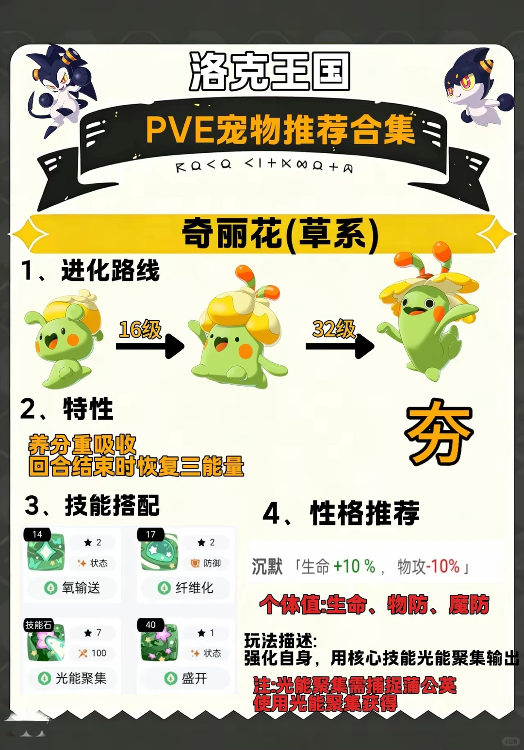 对了,这里有个非常重要的细节需要特别注意:技能“光能聚集”并非天生拥有。你需要先去捕捉蒲公英宠物,然后让奇丽花从它那里学习,才能获得这个核心技能。这算是游戏设计的一个小彩蛋,也算是收集养成乐趣的一部分吧。