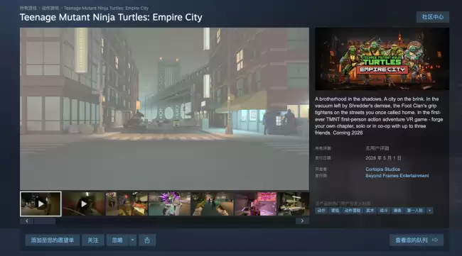 目前,游戏已经在Steam平台提供了试玩版本,感兴趣的朋友不妨先去体验一番。这里是游戏的Steam商店页面链接:https://store.steampowered.com/app/3713650/Teenage_Mutant_Ninja_Turtles_Empire_City/。