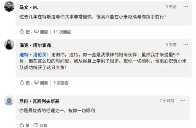 更值得玩味的是,在洛伦茨宣布变动的个人社交账号下,至少还有另一位特斯拉欧洲前运营人员留言呼应,暗示已加入小米。这显然不是巧合,而是小米在欧洲市场,对特斯拉成熟物流体系人才的一次精准“挖角”。