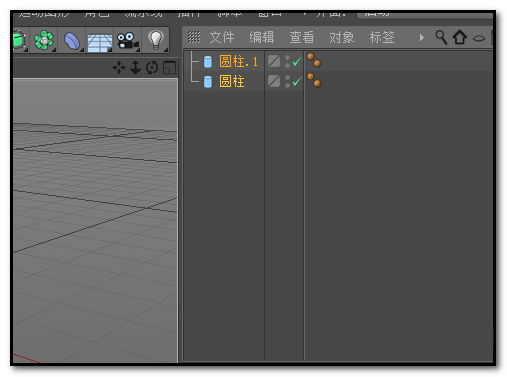 第一步,启动场景,创建两个圆柱基础物体。对象面板里会随即出现“圆柱”和“圆柱1”。先把它们俩都选中。