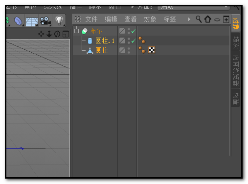 第六步,建立父子级关系。同时选中“圆柱”和“圆柱1”这两个对象,把它们拖拽到“布尔”对象的下方,成为布尔的子级。不过先别急,这时候视图里往往还看不到预期的凹槽效果。