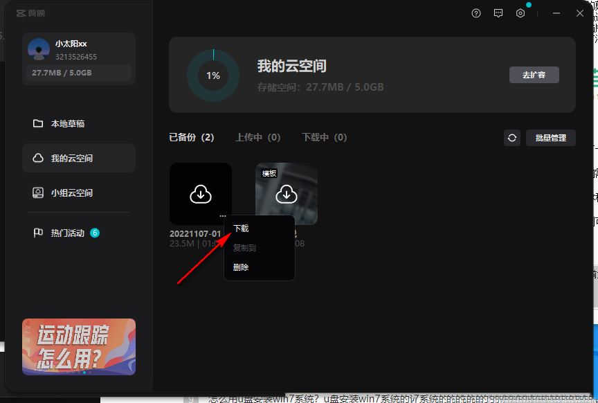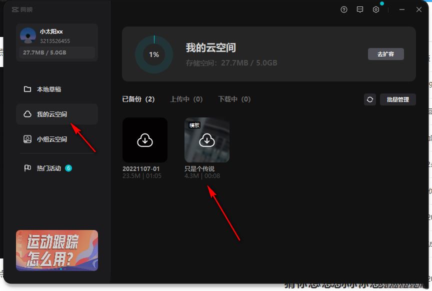 接下来,真正的同步功能出现了。把鼠标移到软件左侧的【我的云空间】选项上,点击进入。此时,右侧窗口展示的,正是你之前通过手机剪映上传到“剪映云”中的所有草稿和模板文件。电脑端可以在这里直接查看和管理手机端的内容。