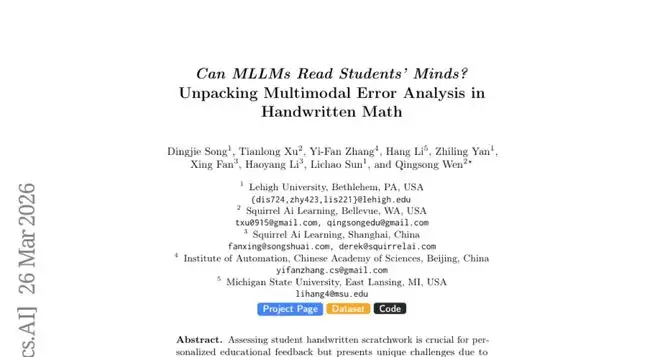 2026年3月,一份由李海大学、松鼠AI学习、中科院自动化所等五所知名院校联合完成的研究,被发布在arXiv预印本平台上(编号:arXiv:2603.24961v1)。这项研究做了一件挺有意思的事:它第一次系统地探究了那些“多才多艺”的多模态大语言模型,到底能不能像人类老师一样,读懂学生手写数学作业里的错误。想刨根问底的读者,不妨用上面的编号去搜搜看原文。