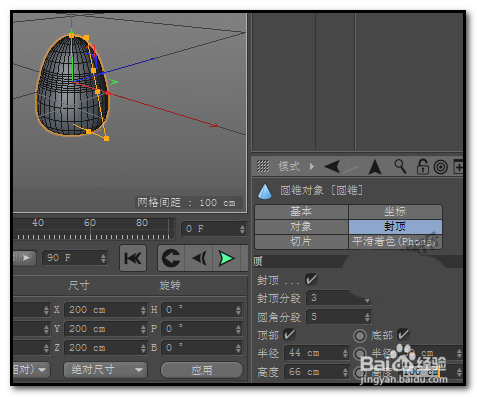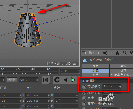 现在,关键点来了。仔细看“对象”参数,你会发现顶部半径的默认值是0——这正是圆锥为什么有个尖顶的原因。用鼠标按住那个向上的小三角,把数值调大。这个过程非常直观:数值越大,顶部的开口就越开阔,尖顶随之消失。至于底部的半径,默认是100,咱们先保持不动。