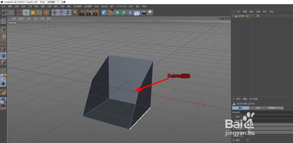 6、当然了,边模式不仅能“建设”,也能“拆除”。如果你想让模型的造型变得更通透,选中一条边后,直接按下键盘上的DELETE键。需要警惕的是,在C4D标准模式下,删除一条边会连带它两侧的附着面一同消失,这常常是创建空洞或改变模型拓扑结构的快捷方式。