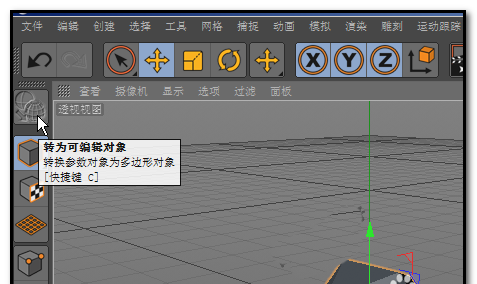 接下来是关键一步:你得把物体转换为可编辑对象。直接按键盘上的 C键,或者点击左侧工具栏上那个转为编辑对象的图标,效果是一样的。