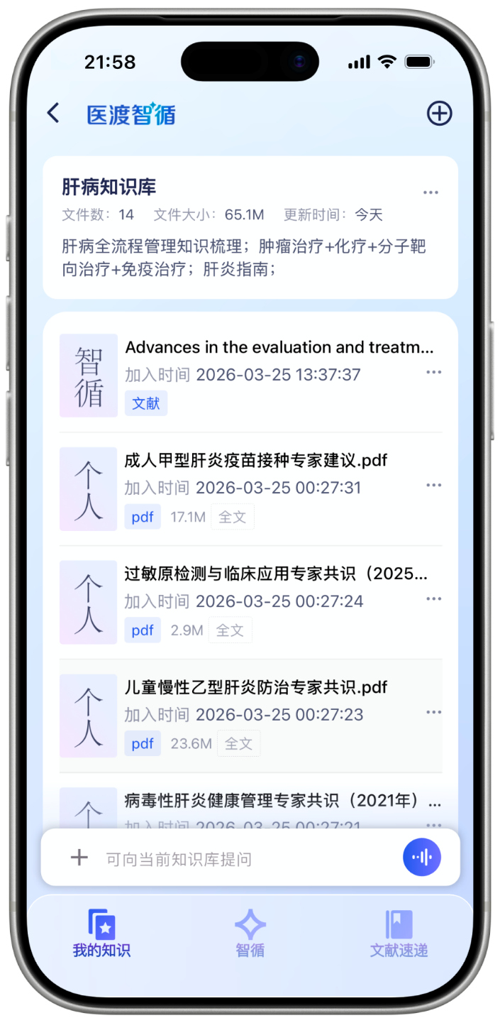 更贴心的是,“个人知识库”功能如同专属“移动书房”,支持医生收藏、上传认可的指南文献,按个人习惯分类整理及提问,形成个性化知识空间。
